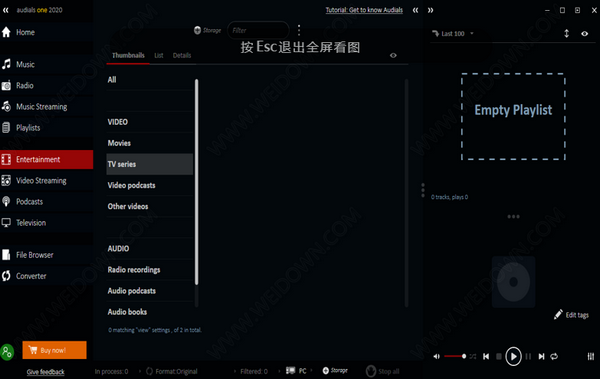 在全屏模式下使用Audials播放,录制和下载所有主要电视格式。