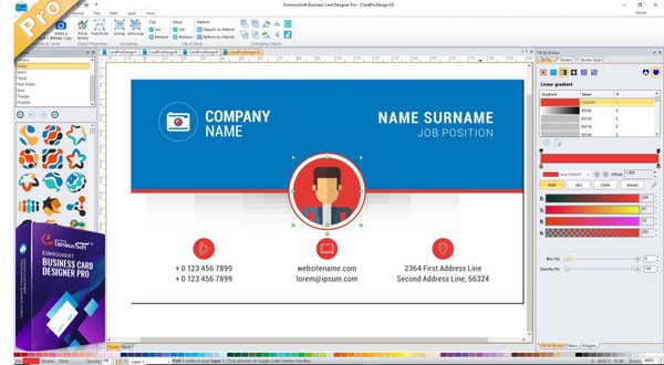 该程序分享了许多由专家设计师预先设计的名片模板。使用它可以轻松快速地开始设计。您可以在名片设计中使用您喜欢的图像、徽标、图形和其他元素来个性化它们。