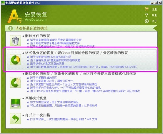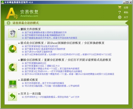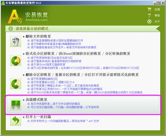 首先要选择数据扫描的模式。根据常见的文件丢失情况,分享了“删除文件的恢复”、“格式化分区的恢复/误Ghost到别的分区的恢复/分区转换的恢复”、“删除分区的恢复/重新分区的恢复/分区打不开提示需要格式化的恢复”和“高级模式恢复”以及“打开上一次扫描”等5个功能模块。