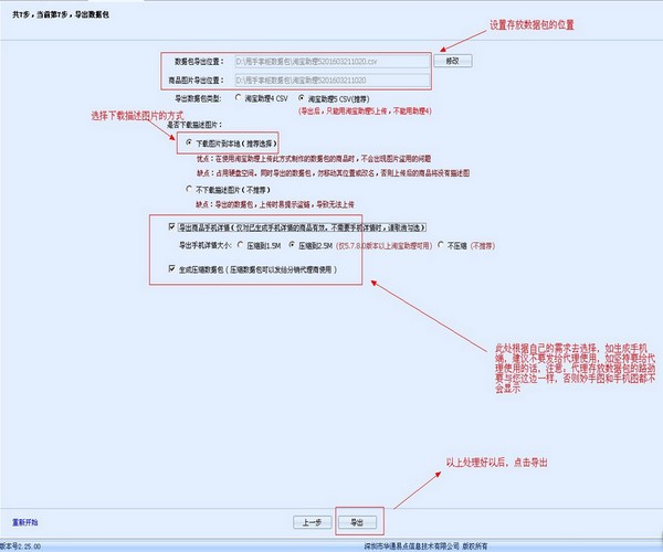 聽聽聽 请选择导出数据包位置、导出文件类型及商品描述图片处理方式,再知识兔点击“导出”按钮