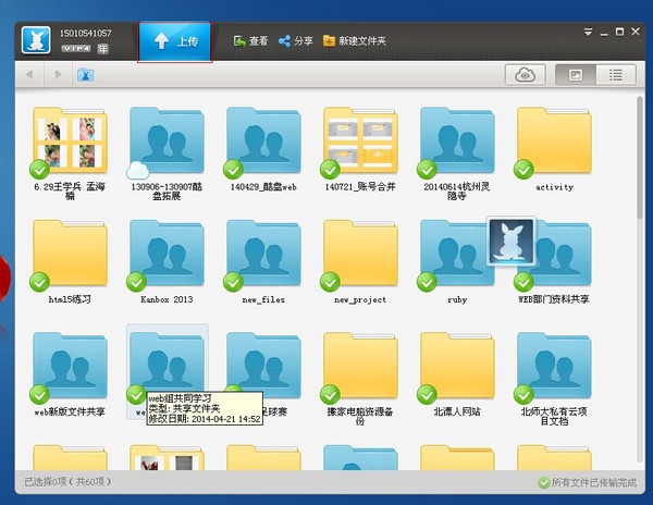 2. 在酷盘界面上知识兔点击 “上传” 按钮选择文件或文件夹上传至酷盘,知识兔也可以直接拖拽我的电脑、我的桌面、资源管理器的文件到酷盘界面进行上传。