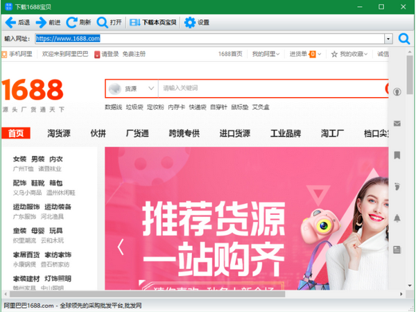 第一步:以1688为例,知识兔点击左上角“下载1688宝贝”按钮,弹出窗口中会自动打开1688的首页,如图所示: