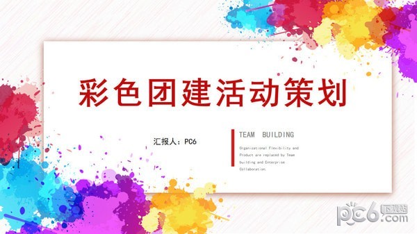 PPT模板封面,知识兔使用了彩色颜料墨迹背景图片。中间放置带有阴影效果的白色矩形文本框,填写团建活动策划PPT标题。界面风格充满青春朝气。