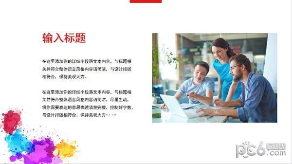 彩色颜料团建活动策划ppt模板顾名思义是一款活动策划PPT模板,PPT模板封面,知识兔使用了彩色颜料墨迹背景图片。中间放置带有阴影效果的白色矩形文本框,填写团建活动策划PPT标题。界面风格充满青春朝气。