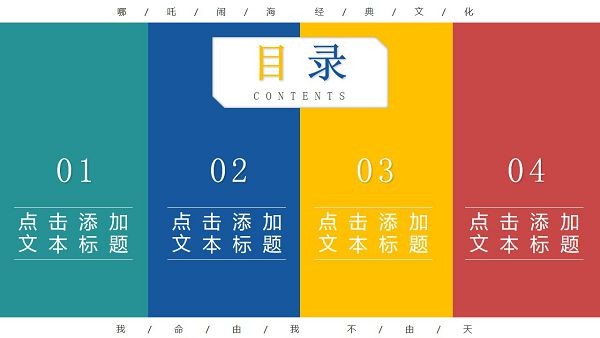 PPT模板封面使用了4张可爱哪吒背景图片。中间填写哪吒闹海PPT标题。界面风格可爱卡通。