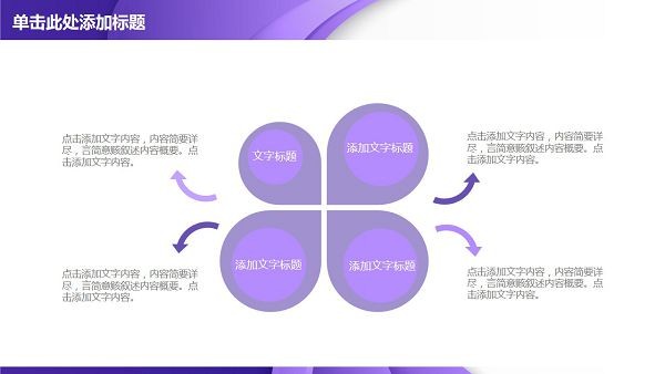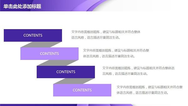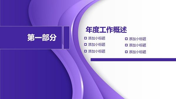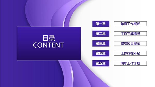PPT模板首页左侧为紫色背景右侧为白色背景,中间放置三条叠加的优美曲线图案填充。