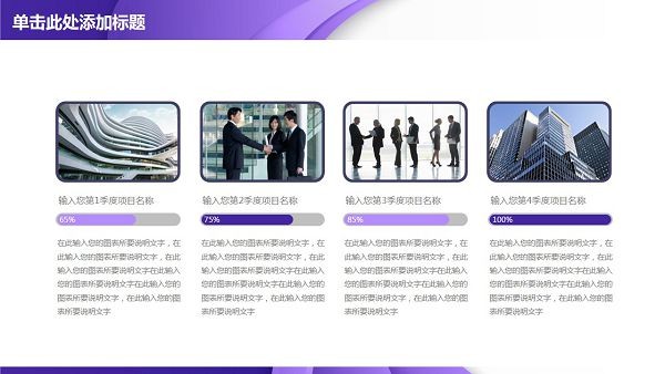 PowerPoint模板内容页,由37张紫色扁平化图表,搭配幻灯片文字排版。中间使用了商业建筑插图、职场人物插图等装饰。