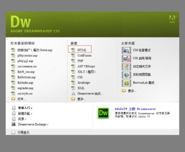 1、知识兔打开DW软件,出现如下窗口,知识兔点击“新建-HTML”