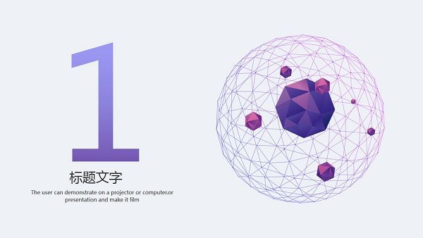 PPT模板封面使用了紫色点线多边形设计的虚拟星球背景图片。下方填写商务汇报PPT标题文字。界面风格简约精致。