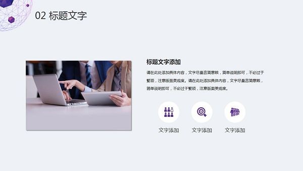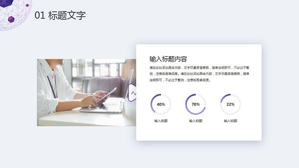 PowerPoint模板内容页,由22张紫色渐变幻灯片图表, 搭配PPT文字排版。另外使用了商务办公插图、职场人物插图等装饰。
