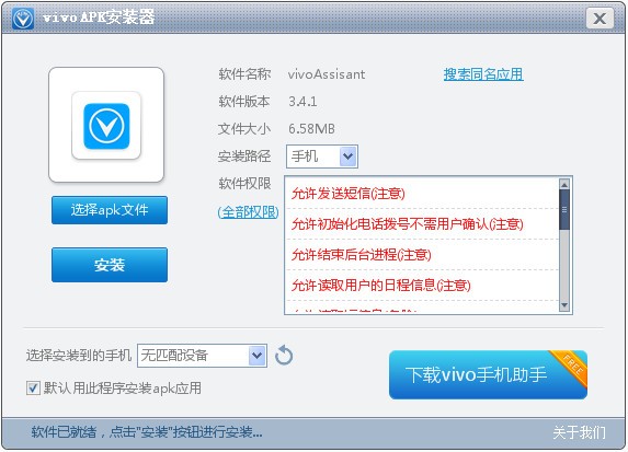 vivo apk安装器是一款方便易用的安卓apk安装器,直接通过电脑安装安卓手机软件,还可以查看要安装的软件图标和相关权限。使用简单,将需要安装的apk软件拖到该软件界面内就可以进行安装了。