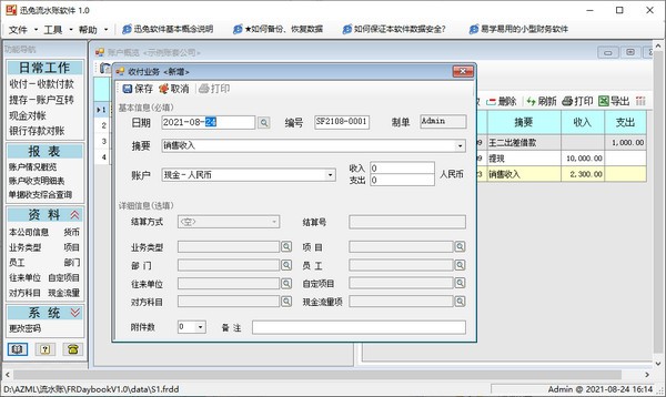 迅兔流水账软件是完全免费的软件,采用了当前流行的开发平台,具有安全稳定、易学易用的特点;应用于企业现金银行账户管理,是一款很适合小企业的小型流水账管理软件。