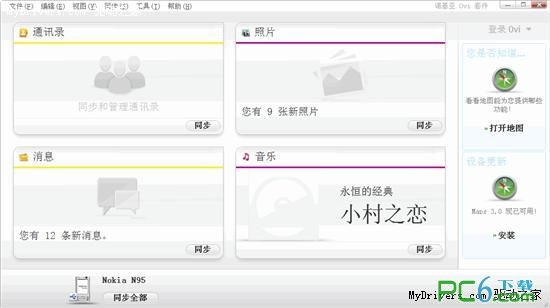 Ovi Suite采用了全新的外观界面设计,通讯录、消息、照片、音乐这4大常用功能被放到了最显著的位置,方便用户使用,此外新版的软件更新功能也非常好用,各种升级信息一目了然,个人感觉比PC Suite中集成的Software Updater要易用和直观的多。