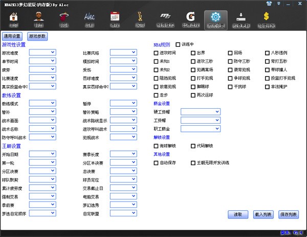 nba2k13梦幻星辰,功能:1.球员属性;2.游戏设置;3.存档路径设置