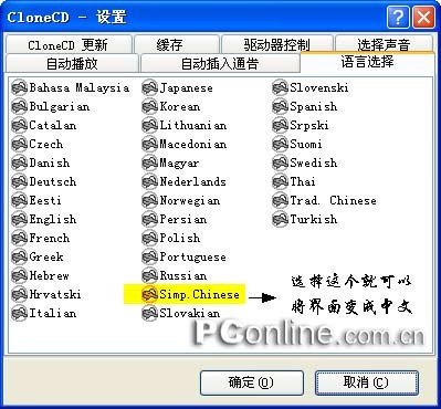 一路next下去就可以安装上,但是发现CloneCD是英文操作界面,对那些E文不是很好的朋友在操作上有些困难。不过你可以在语言设置中选择“Simp.Chinese”(图1),这样一来CloneCD就变成中文界面。