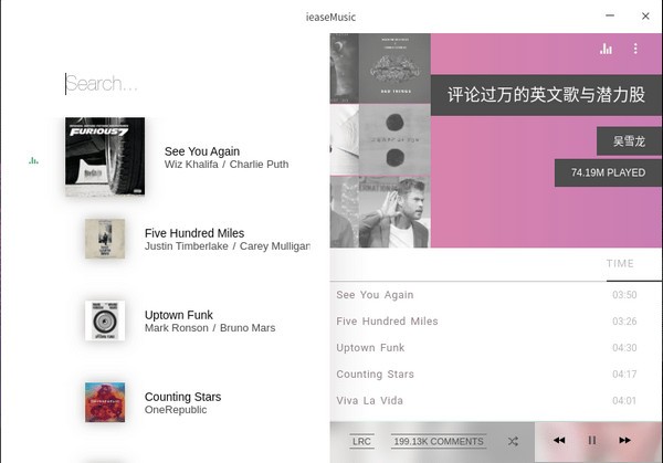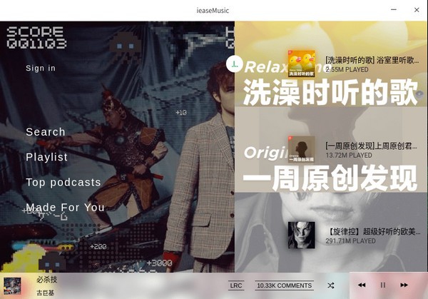 每次打开 ieaseMusic 你都看到一个随机推荐的歌单序列,而且知识兔这些圆形图标还不能向左滑动切换,不理解作者的设计思路是什么,右上角按钮分别可切换搜索、频道菜单。底部的播放控制单元具备循环、随机、单曲循环播放选择,单击艺人名称可进入其主页查看作品信息,但由于接口限制,软件还不能操作 Follow 及 Comment 功能。软件支持歌曲切换消息推送,在界面知识兔点击右键还可以选择一些快捷操作。