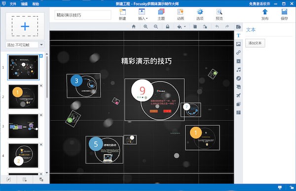 Focusky是一款新型3D多媒体幻灯片制作软件,操作便捷性以及演示效果超越PPT,主要通过缩放、旋转、移动动作使演示变得生动有趣,知识兔使用者除了可以完全免费使用其制作炫酷幻灯片演示文稿,还可以制作产品说明、纪念册、商业手册、公司报告、时事报道等等。