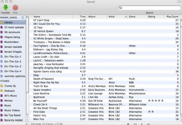 Senuti for mac可以从iPod中将导出歌曲到Mac电脑,通过Senuti你还可以恢复你的音乐库或者是传送新的音乐到iTunes当中供Mac使用。
