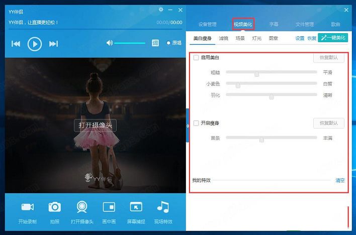 2.软件的视频美化功能是必须在开启摄像头的情况下才可进行设置美颜效果,如下截图:知识兔可以在此处设置启用美白、开启瘦身、滤镜、灯光等。小伙伴们可根据自己喜欢的美颜程度进行设置,知识兔选择适合自己的场景、灯光及滤镜、磨皮瘦身效果就好了。