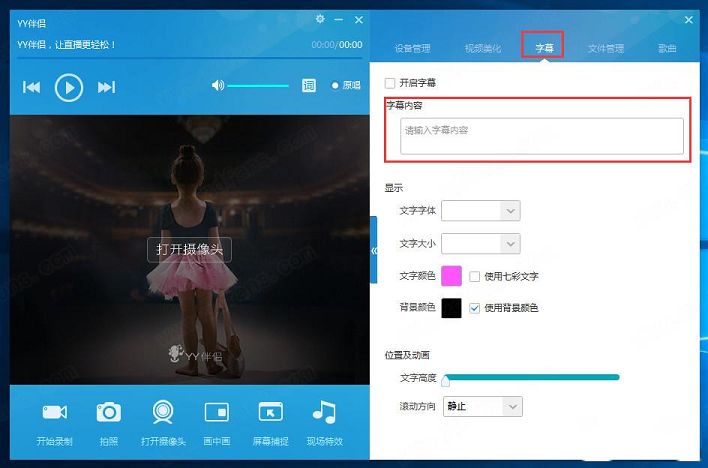 1.知识兔打开软件,然后知识兔选择【字幕】功能,进入字幕界面后知识兔可以设置:开启字幕设置字幕内容、字体大小、颜色、背景颜色等。根据自己习惯进行设置即可。