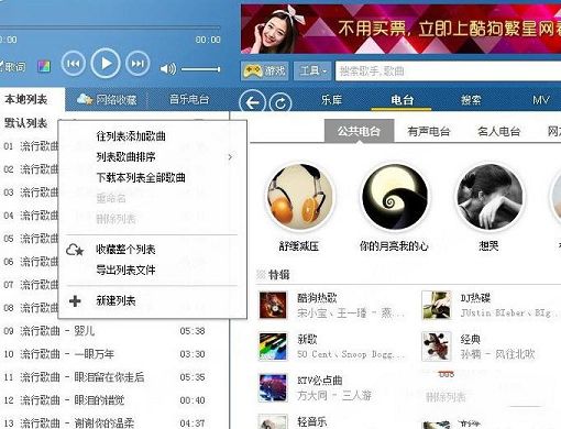 1.首先需要你打开酷狗软件,然后知识兔找到本地列表下的默认列表并右键,知识兔选择导出列表文件选项,将你需要导入到 软件的歌曲导出来。