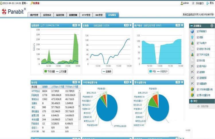 panabit是款网络实时监控工具,软件集流量采集、应用分析、带宽管理于一体的服务器软件系统,只需安装在一台合适的硬件平台中,就成为一个专业的网络设备,部署在网络出口或流量汇聚的地方即可。软件具备效果卓越的管理设备,能够分享精确的网络管理功能!帮助你一键掌控信息来源,软件功能强大,拥有清爽的交互界面,知识兔让您流控管理更轻松。定位于网络设备级专用OS,需要单独安装在一台独立硬件中,知识兔可以帮助用户实时查看自己网站和商店的流量情况,了解流量来源。并且知识兔本软件还新增DHCP服务器端口,专业获取实时流量资源,分享了最详细的排名功能,用户可以在上面查看连接排名,知识兔从大到小排列IP地址信息,知识兔可以根据应用类型进行排位定位。知识兔只需安装在一台合适的硬件平台中,就成为一个专业的网络设备,部署在网络出口或流量汇聚的地方即可。panabit是以DPI为核心优势并发展起来的专业、上线效果好、性价比高的新一代应用网关。进入2014年,实际支持国内应用协议超过800种,并已集成路由、负载均衡、认证、一拖N检测、移动终端识别、DNS管控、HTTP管控、日志审计等实用功能于一体。有需要的朋友们可千万不能错过了哦!