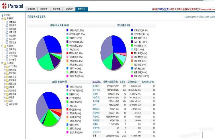 Panabit接入网络中,缺省即加载所有特征库,并立即开始自动分析网络中流量构成和显示统计数据。软件根据应用类别缺省分为11 大类,每一类别又可分为若干子类别。在一个千兆链路网络环境中,通常只需6-8 小时的分析,即可分享全面的统计报表,如饼图百分比和应用实时数据方式,为下一步制定管理策略分享了决策支持。