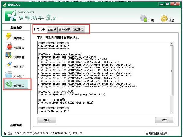 7、知识兔点击”清理相关”,知识兔可以查看”日志记录””白名单””备份恢复””隐藏搜索”等,知识兔点击可以查看。