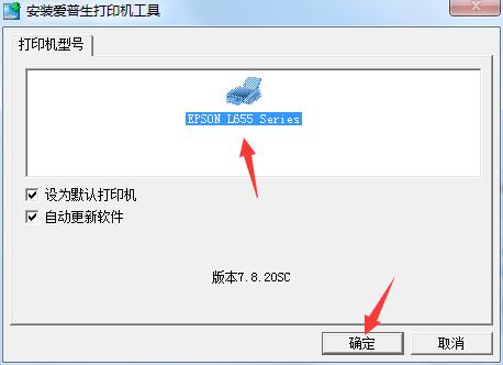 1、知识兔下载爱普生L655驱动,使电脑和一体机连接,知识兔根据系统选择对应的安装包,知识兔小编是32位,运行L655_x86_241JAUsHomeExportAsiaML.exe文件,弹出如图窗口,查看打印机型号是否一致,知识兔选择是否设为默认打印机和自动更新软件,知识兔点击”确定”