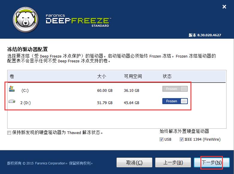 4.选择需要冻结的驱动器配置,单击【下一步】