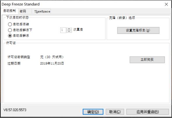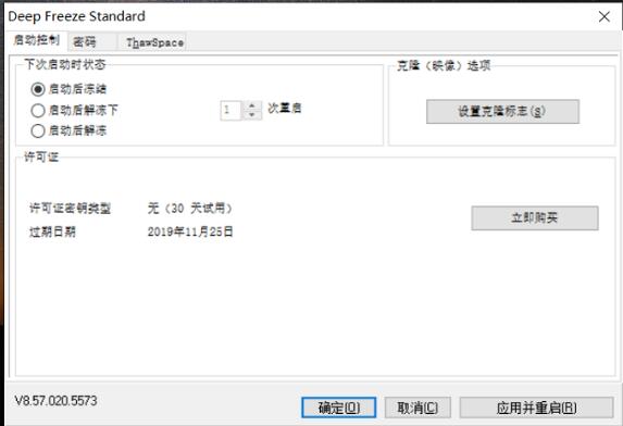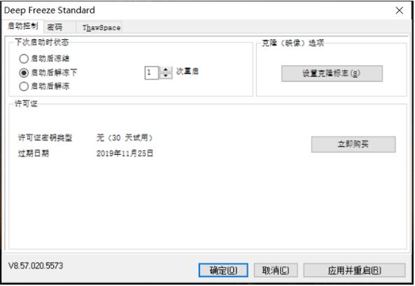 第二个选项”启动后解冻下”,后面跟随着几次启动的选择项,它的默认次数是1,代表了知识兔启动后第一次的时候电脑硬盘是不被保护的状态,知识兔可以根据自己情况来具体选择次数,超过次数后电脑会自动进入保护状态。