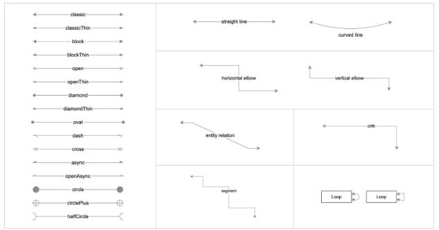 内置了直线、曲线、拐线、正交线、关系线、循环线等常见连线样式和 10 多种箭头样式。