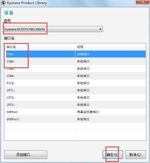 6.选择打印机型号【Kyocera ECOSYS MA2100cfx】,知识兔选择端口名,然后知识兔单击【确定】