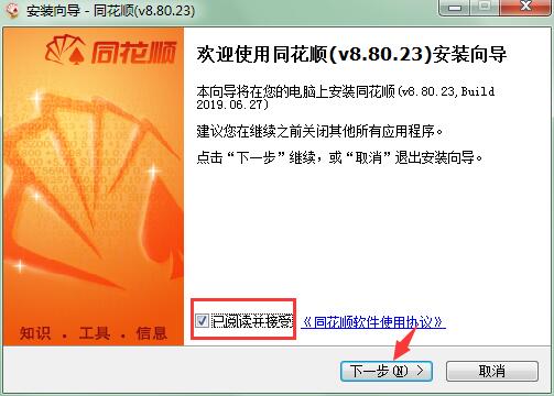 1、知识兔下载最新版的同花顺软件,进入安装向导界面,在”已阅读并接受”选项前面打勾,知识兔点击”下一步”