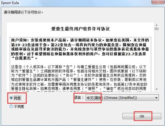 4.阅读软件的许可协议,勾选【同意】,知识兔选择安装语言【中文简体】,单击【OK】
