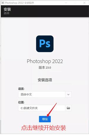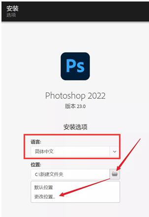 2.选择安装语言,默认的就是【简体中文】,知识兔选择Photoshop2022安装路径,默认的是C盘,知识兔可以知识兔点击文件夹图标修改到其它文件夹