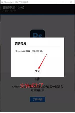 5.Photoshop2022安装完成,弹出安装完成的窗口,知识兔单击【关闭】即可
