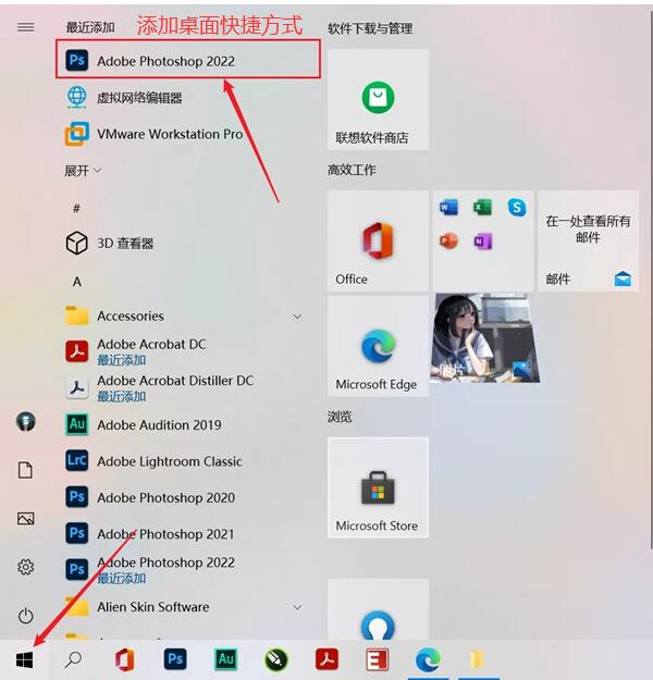 6.安装完成在桌面会自动生成一个快捷图标,没有的话知识兔点击桌面左下角的按钮,找到Adobe Photoshop CC2022程序直接拖拽到桌面即可