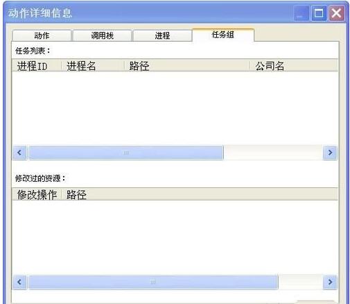 “任务组”选项卡显示了该程序所在任务组的详细信息,知识兔包括关联程序的进程ID、进程名、路径、公司名等数据。如果知识兔程序有修改数据的行为,修改数据行为也会被显示出来。(一般情况下,没有任务组的程序不会有该信息)