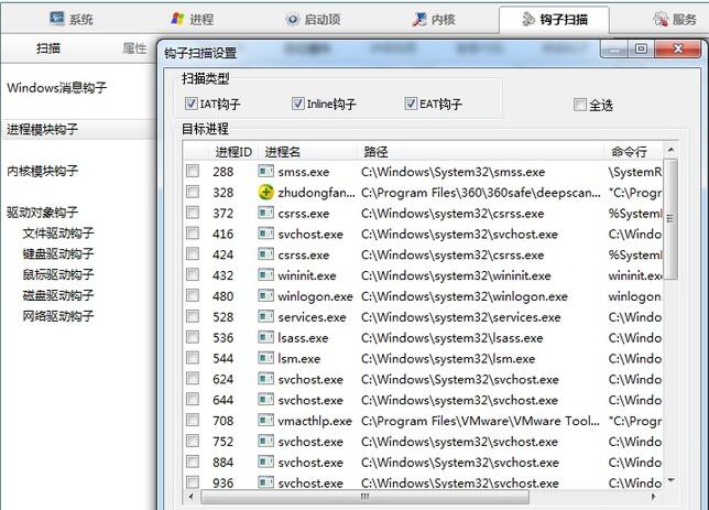 首先打开上方选项栏的钩子扫描,然后知识兔选择左侧的列表,对想要搜索的内容进行扫描,一些已经开启的软件,知识兔可以在进程中查找,想要查找键盘鼠标相关的则可以查找相应内容,