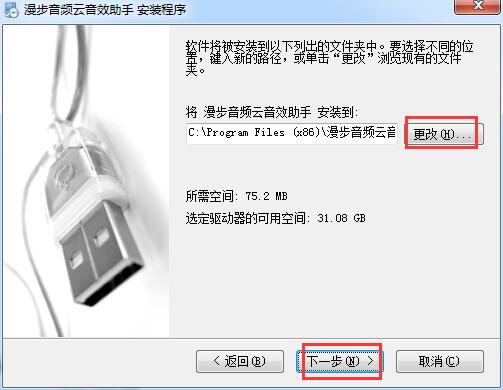 2.选择软件的安装文件夹,默认的是【C:\Program Files (x86)\漫步音频云音效助手】,单击【更改】自定义