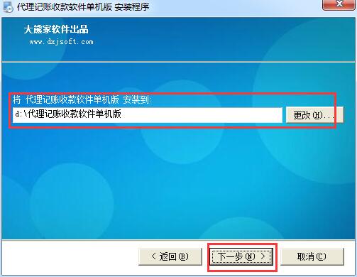 2.选择软件的安装目的地,默认的是【d:\代理记账收款软件单机版】,单击【浏览】修改,单击【下一步】开始安装