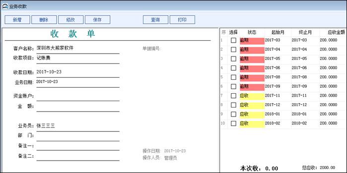若不能收全一期金额时,不能勾选右边。直接在左边输入金额,且【业务日期】必须为收款期间内的任意一天。例:某公司今年第一季度的代账费是600元,收款间隔是3个月。本应一次收600元,但先收回400元,则业务日期为今年1.1-3.31日的任意一天,金额为400元。后续再收回200元,则同样再做一笔收款单,业务日期同样为1.1-3.31的任意一天。