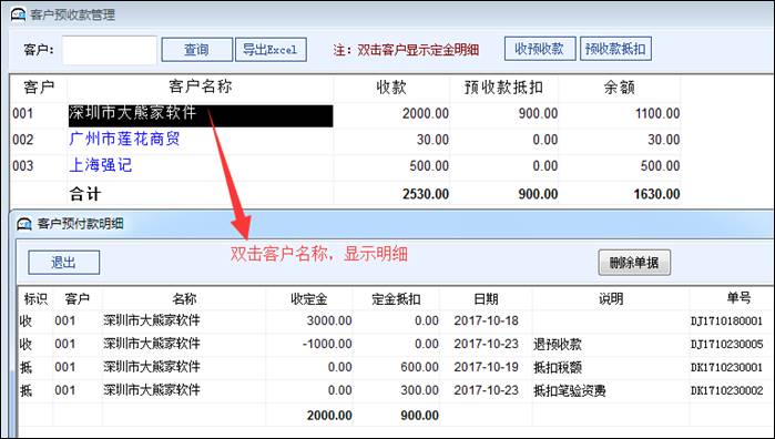 可按客户名模糊查询。知识兔双击客户名称显示此客户的预收款、抵扣、退款明细,如下图。