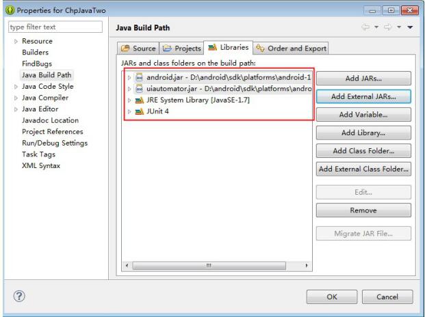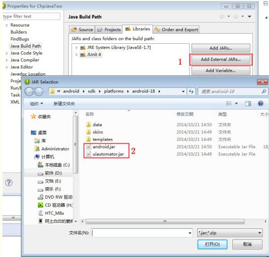 找到路径sdk\platforms\android-18下面的android.jar和uiautomator.jar添加进来(android-17以上):