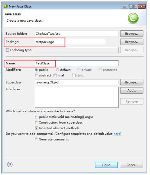 输入包名和类名,包名的命名规则:首字母为小写,类名:首字母英文大写,后面字母均为小写,多个单词组成,每个单词的首字母大写