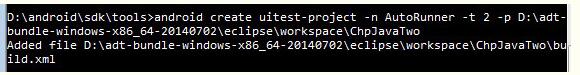 android create uitest-project -n AutoRunner -t 2 -p D:\adt-bundle-windows-x86_64-20140702\eclipse\workspace\ChpJavaTwo