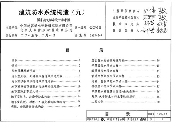 15CJ40-9图集是建筑防水系统构造图集中的第九章,图集包括防水层材料选用表、做法选用表、节点大样和工程实例等内容,知识兔适用于建筑屋面、地下室、隧道、地铁等防水工程。