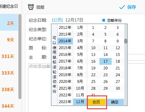 打开纪念日,在纪念日期那可用农历和公历的转换,也可忽略年份(如下图所示)