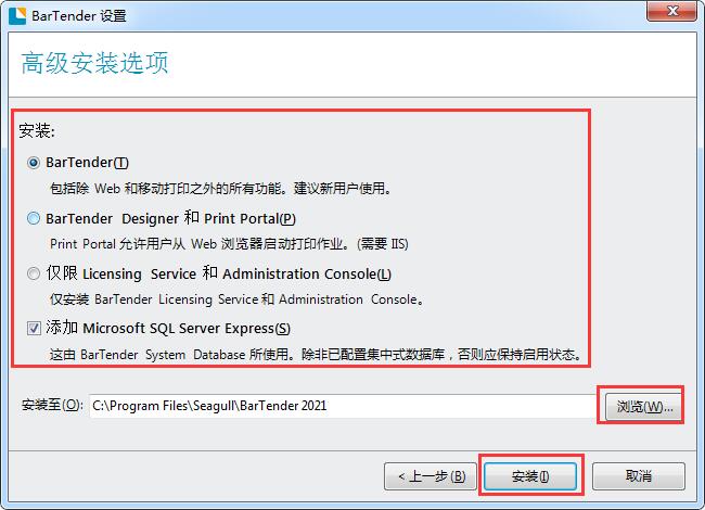 4.选择安装的组件,知识兔选择安装位置,默认的为【C:\Program Files\Seagull\BarTender 2021】,单击【浏览】自定义,单击【安装】开始安装进程